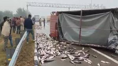 गाजियाबाद में सड़क पर बिखरी मछलियाँ, लूटने उमड़ी भीड़