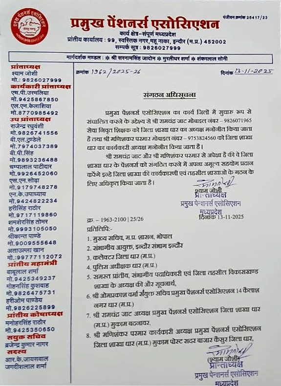 प्रमुख पेंशनर्स एसोसिएशन, मध्यप्रदेश द्वारा संगठन को और सुदृढ़ एवं सक्रिय बनाने के उद्देश्य से जिला धार में निम्न नियुक्तियाँ की