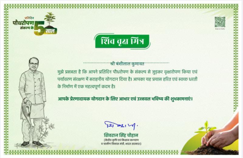 भारतीय जनता पार्टी के वरिष्ठ नेता मध्यप्रदेश के लोकप्रिय पुर्व मुख्यमंत्री भारत सरकार में केंद्रीय कृषि एवं ग्रामीण विकास मंत्री श्री शिवराज सिंह चौहान ने अपने जन्म दिवस पर आम जनों और समर्थको से अपिल की थी इस बार फुल माला,श्राल होंडीग बेनर से स्वागत वंदन नहीं करें जहां पर भी आप हैं वहां पर एक पौधा लगाकर मुझे उसकी फोटो भैज देना,,,, इस अवसर पर रतलाम ग्रामीण के नामली नगर में पर्यावरण प्रेमी एवं भारत सरकार कृषि मंत्री एवं ग्रामीण विकास आवास योजना मंत्री शिवराज सिंह चौहान के समर्थक सामाजिक कार्यकर्ता बंशीलाल कुमावत विधायक प्रतिनिधि शासकीय महाविद्यालय नामली द्वारा आम के पौधे लगाकर इस पहल का हिस्सा बने जिस पर उन्हें एक सर्टिफिकेट ऑनलाइन भी प्राप्त हुआ हैं।