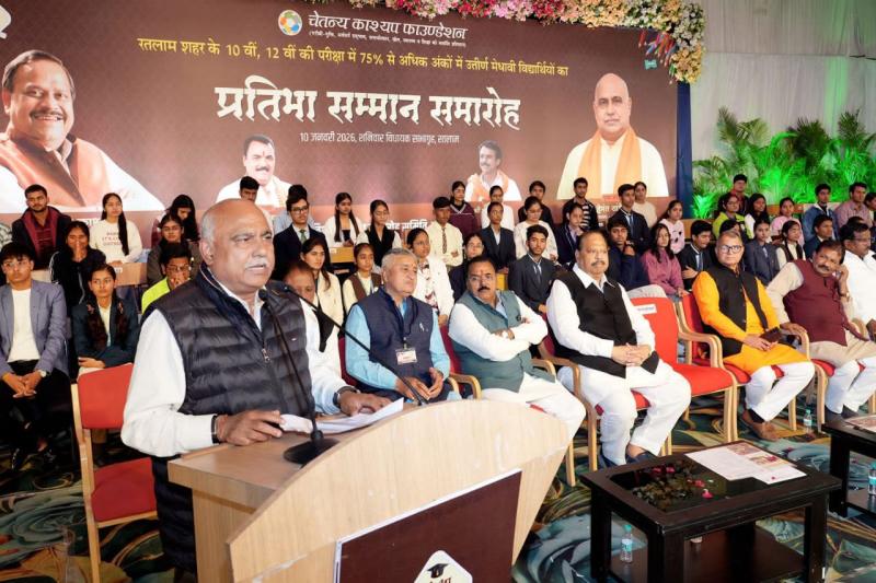रतलाम: चेतन्य काश्यप फाउंडेशन द्वारा आयोजित प्रतिभा सम्मान समारोह में प्रदेश भाजपा अध्यक्ष हेमंत खंडेलवाल के मुख्य आतिथ्य में 2500 से अधिक मेधावी विद्यार्थियों को सम्मानित किया गया। बरबड़ स्थित विधायक सभागृह पर आयोजित समारोह की अध्यक्षता कैबिनेट मंत्री, फाउंडेशन अध्यक्ष चेतन्य काश्यप ने की। विशेष अतिथि भाजपा जिलाध्यक्ष प्रदीप उपाध्याय रहें। संभाग प्रभारी सुरेश आर्य, जिला प्रभारी प्रदीप पांडेय, उज्जैन विधायक अनिल जैन कालूहेड़ा, ग्रामीण विधायक मथुरालाल डामर, आयोजन समिति सलाहकार पूर्व महापौर शैलेंद्र डागा, निर्मल लुनिया मंचासीन रहें। प्रदेश भाजपा अध्यक्ष खंडेलवाल ने इस मौके पर कहा कि लोग कई बार बढ़े आयोजन, भन्डारे करते हैं, लेकिन यदि हर व्यक्ति गरीब बच्चों की चिंता कर लें कि इनकी शिक्षा कैसे होगी? इनमें प्रतिभा हैं तो उसे कैसे आगे बढ़ाएंगे? यदि एक बच्चे की सेवा भी कर ले तो चारधाम की यात्रा से बढ़ा काम होगा।
