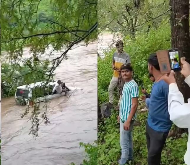 घटना से जुड़ा जो वीडियो वायरल हो रहा है, उसमें देखा जा सकता है कि एक बोलेरो गाड़ी नदी के तेज बहाव में फंसी हुई है। हालात इतने खराब दिख रहे हैं कि गाड़ी में मौजूद लोगों ने बिना देर किए छंलाग लगा दी। अगर खजूर के पेड़ से गाड़ी नहीं अटकती तो हालात कुछ और भी हो सकते थे।