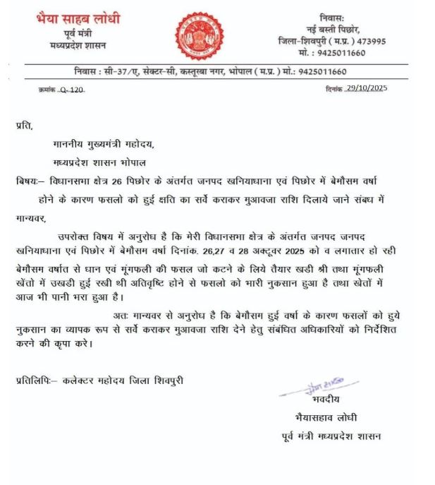 शिवपुरी। पिछोर विधानसभा क्षेत्र के किसानों को बेमौसम बारिश ने बड़ा झटका दिया है। किसानों की फसलें भारी नुकसान की चपेट में आ गई हैं। इसी को लेकर पूर्व मंत्री भैया साहब लोधी ने मुख्यमंत्री डॉ. मोहन यादव को पत्र लिखा है। पूर्व मंत्री भैया साहब लोधी ने अपने पत्र में उल्लेख किया है कि 26, 27 और 28 अक्टूबर 2025 को हुई बेमौसम बारिश से पिछोर विधानसभा क्षेत्र के अंतर्गत जनपद खनियाधाना और पिछोर के कई गांवों में फसलें बर्बाद हो गईं। उन्होंने मुख्यमंत्री से आग्रह किया है कि प्रभावित क्षेत्रों का त्वरित सर्वे कराकर किसानों को उचित मुआवजा प्रदान किया जाए।