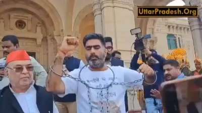 यूपी में बजट सत्र में सपा का प्रदर्शन, विधायक हाथ पैरों में जंजीर पहने दिखे